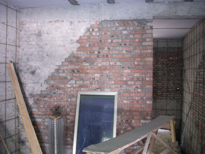 對(duì)于抗震驗(yàn)算需配筋的墻體:先將原粉刷層打掉,清除松散砂漿及浮灰,水沖無(wú)浮灰;按設(shè)計(jì)要求掛鋼筋網(wǎng),用M10水泥砂漿抹面35厚內(nèi)摻水泥用量1%礦棉纖維。