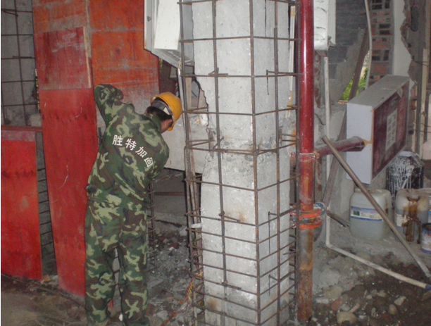 此方法適用于柱鋼筋壓曲移位情況,加固施工方法是:打掉柱表層裝飾層及抹灰層,首層柱加固須開(kāi)挖至地梁頂面;柱身及地梁表層砼鑿毛,用鋼絲刷及高壓水清除干凈;下料、加工制作鋼筋;新增縱向鋼筋兩端采用植筋法錨固,柱上端應(yīng)穿過(guò)樓板與上柱腳連接,箍筋應(yīng)穿透磚墻封閉焊接,并同縱筋點(diǎn)焊以緊固縱筋;鋼筋安裝完畢,分段支模,分段澆搗細(xì)石砼;拆模養(yǎng)護(hù)。