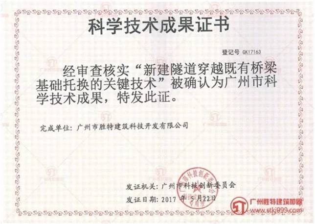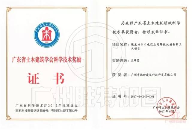 本創(chuàng)新技術(shù)是在傳統(tǒng)錨桿靜壓樁技術(shù)基礎(chǔ)上的巨大突破, 創(chuàng)新點包括: 1. 根據(jù)工程實際情況因地制宜的組合使用“群錨靜壓樁結(jié)構(gòu)”(專利號ZL201120281350.1)和“建筑物厚板基礎(chǔ)結(jié)構(gòu)豎直樁托換加固封樁孔方法”(專利號ZL200910235342.0)、“樁基加固預(yù)應(yīng)力鎖樁方法” (專利申請?zhí)枺?00710305695)3項新工藝,可以達到工程設(shè)計的單樁承載力較高這一要求--達到2500KN,超過了中型壓樁機(壓樁力≤2400kN)。 2. 室內(nèi)地坪提供的反力荷載隨時隨地可利用。 3. 不受室內(nèi)高度的限制,可在高度2m以下空間施工;施工方便可拆卸移位置,安全可靠、簡單易行。 項目第一完成人是我司董事長兼總工,高級工程師吳如軍。 《勝特特刊》秉承著“增強企業(yè)凝聚力,弘揚企業(yè)文化”的宗旨,使其成為勝特人傳承行業(yè)文化、企業(yè)文化、生活文化的有效途徑,把公司的最新動態(tài)展現(xiàn)給廣大友人。 本屆創(chuàng)交會5月26日至27日如期在廣州琶洲國際會展中心舉辦,我司有2項入選參展項目,分別為加固改造、托換糾傾領(lǐng)域綠色技術(shù)與一種地下圓形停車庫(四季快安智能停車場)。 十九年來,公司以科研推動施工技術(shù)進步,以施工技術(shù)實踐轉(zhuǎn)換科技成果,通過不斷的技術(shù)創(chuàng)新,不但具有較強的開發(fā)與設(shè)計能力,更具有較高的現(xiàn)場施工能力。每年完成各種加固與改造、托換與糾傾及邊坡加固等工程二百余項,至今已完成三千余項特種工程設(shè)計與施工,攻克了一個又一個的技術(shù)難題。公司本著“優(yōu)勝、特別、務(wù)實、開拓”的企業(yè)精神,艱苦創(chuàng)業(yè),力求精益求精,做到了人無我有,人有我優(yōu)。 相繼獨立完成了多項重大加固改造托換工程,業(yè)務(wù)范圍遍及全國各地,取得了很高的知名度與滿意度,樹起了良好的公司品牌形象,將“勝特”打造成中國加固改造行業(yè)的優(yōu)質(zhì)品牌。