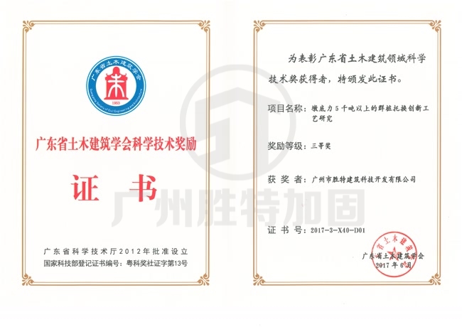 廣州市勝特建筑科技開發(fā)有限公司榮獲廣州市科學技術獎“墩底力5千噸以上的群樁托換創(chuàng)新工藝研究”科技獎勵榮譽證書