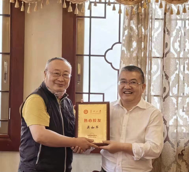▲周波會(huì)長(zhǎng)為吳如軍董事長(zhǎng)頒發(fā)"熱心校友"牌匾