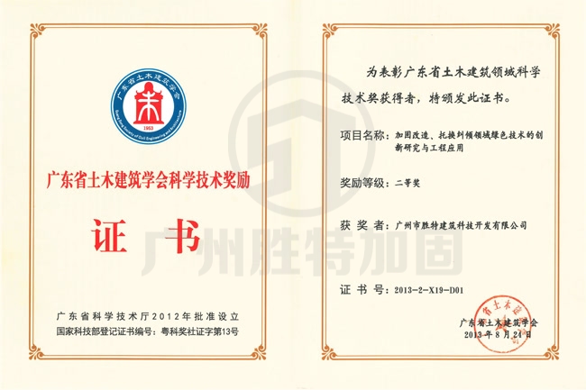 科學(xué)技術(shù)獎勵證書-廣州市勝特建筑科技開發(fā)有限公司資質(zhì)證書展示,勝特加固公司榮譽(yù)一覽.我司專注于危房加固,橋梁承臺加固等工程設(shè)計及施工,擁有建筑加固資質(zhì),加固資質(zhì)證書等一系列特種工程資質(zhì).公司加固技術(shù)實(shí)力雄厚,國家高新技術(shù)企業(yè),獲科學(xué)技術(shù)獎勵證書!歡迎來電咨詢加固工程業(yè)務(wù)