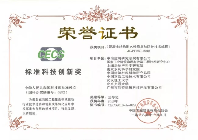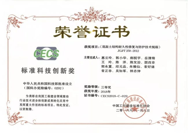《混凝土結(jié)構(gòu)耐久性修復(fù)與防護(hù)技術(shù)規(guī)程》榮獲2018年度標(biāo)準(zhǔn)科技創(chuàng)新獎(jiǎng)三等獎(jiǎng)