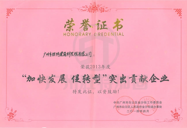 加快發(fā)展促轉型突出貢獻企業(yè)-廣州市勝特建筑科技開發(fā)有限公司資質證書展示,勝特加固公司榮譽一覽.我司專注于危房加固,橋梁承臺加固等工程設計及施工,擁有建筑加固資質,加固資質證書等一系列特種工程資質.公司加固技術實力雄厚,國家高新技術企業(yè),獲加快發(fā)展促轉型突出貢獻企業(yè)稱號!歡迎來電咨詢加固工程業(yè)務