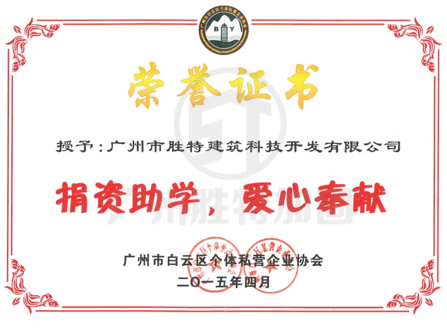 我公司榮獲廣州市白云區(qū)個體私營企業(yè)協(xié)會頒發(fā)“捐資助學,愛心奉獻”榮譽證書。