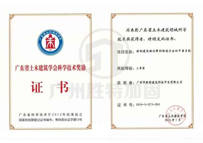 廣州勝特加固公司申報(bào)項(xiàng)目“控制建筑物沉降的快速方法和可靠系統(tǒng)”榮獲2018年度廣東省土木建筑學(xué)會(huì)科學(xué)技術(shù)三等獎(jiǎng)。