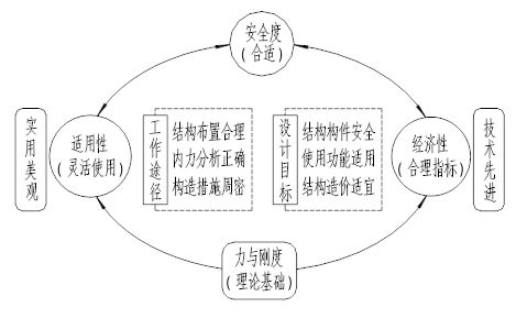 人們一談起結(jié)構(gòu)設(shè)計(jì),往往會(huì)產(chǎn)生第一個(gè)反應(yīng):“結(jié)構(gòu)設(shè)計(jì)是否安全”,可見(jiàn)“安全”在結(jié)構(gòu)設(shè)計(jì)中是處于何等重要地位。需要明確的是,保證結(jié)構(gòu)安全確實(shí)是結(jié)構(gòu)設(shè)計(jì)的首要任務(wù),但并非是結(jié)構(gòu)設(shè)計(jì)的唯一任務(wù)。必須強(qiáng)調(diào)的是,保證結(jié)構(gòu)安全是對(duì)結(jié)構(gòu)設(shè)計(jì)的最基本、最起碼要求,對(duì)于一項(xiàng)工程的結(jié)構(gòu)設(shè)計(jì)來(lái)說(shuō),除“保證安全”這一最低要求外,還有其他許多內(nèi)涵豐富的要求,也即通常所說(shuō)的,結(jié)構(gòu)設(shè)計(jì)做到安全只是初級(jí)階段的“行”,只有同時(shí)能滿足其他方面的要求,才算達(dá)到較高境界的“好”。“行”與“好”是兩個(gè)不同層次的概念。下圖中最上及左右共三個(gè)圓圈內(nèi)的標(biāo)注即是對(duì)結(jié)構(gòu)設(shè)計(jì)全面要求的概括。這是結(jié)構(gòu)設(shè)計(jì)必須優(yōu)化和優(yōu)化目標(biāo)的最精練圖解示意。