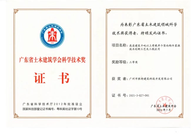 近日,廣東省土木建筑學會公布了2021年廣東省土木建筑學會科學技術(shù)獎獲獎名單,我司“高層建筑千噸以上荷載單個豎向構(gòu)件置換技術(shù)創(chuàng)新工藝及工程實踐應用”項目榮獲廣東省土木建筑學會科學技術(shù)獎三等獎。