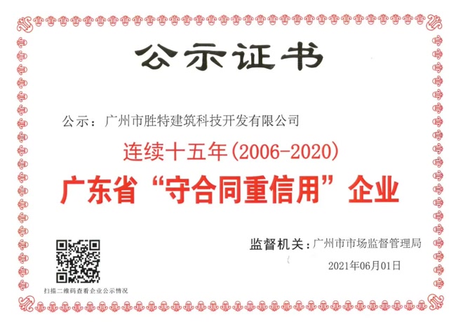 近日,廣東省市場監(jiān)督管理局對(duì)2020年廣東省“守合同重信用企業(yè)”進(jìn)行公示,廣州市勝特建筑科技開發(fā)有限公司(以下簡稱“我司”)順利通過了廣東省市場監(jiān)督管理局的最終審查,這已是我司連續(xù)15年獲此殊榮。