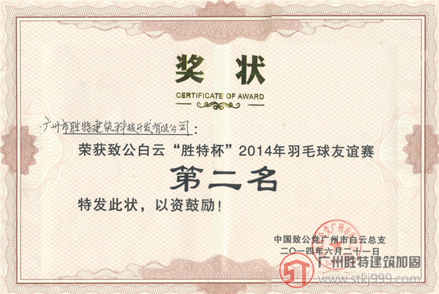致公白云“勝特杯”羽毛球賽第二名-廣州市勝特建筑科技開發(fā)有限公司資質(zhì)證書展示,勝特加固公司榮譽(yù)一覽.我司專注于危房加固,橋梁承臺(tái)加固等工程設(shè)計(jì)及施工,擁有建筑加固資質(zhì),加固資質(zhì)證書等一系列特種工程資質(zhì).公司加固技術(shù)實(shí)力雄厚,國(guó)家高新技術(shù)企業(yè),歡迎來(lái)電咨詢加固工程業(yè)務(wù)