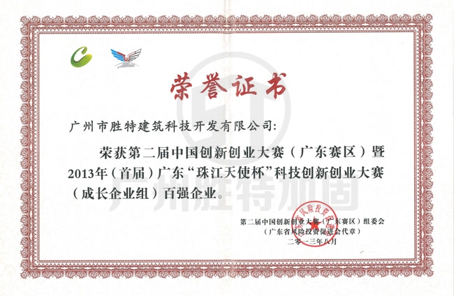 “珠江天使杯”科技創(chuàng)新創(chuàng)業(yè)大賽百?gòu)?qiáng)企業(yè)-廣州市勝特建筑科技開發(fā)有限公司資質(zhì)證書展示,勝特加固公司榮譽(yù)一覽.我司專注于危房加固,橋梁承臺(tái)加固等工程設(shè)計(jì)及施工,擁有建筑加固資質(zhì),加固資質(zhì)證書等一系列特種工程資質(zhì).公司加固技術(shù)實(shí)力雄厚,國(guó)家高新技術(shù)企業(yè),獲“珠江天使杯”科技創(chuàng)新創(chuàng)業(yè)大賽百?gòu)?qiáng)企業(yè)稱號(hào)!歡迎來電咨詢加固工程業(yè)務(wù)