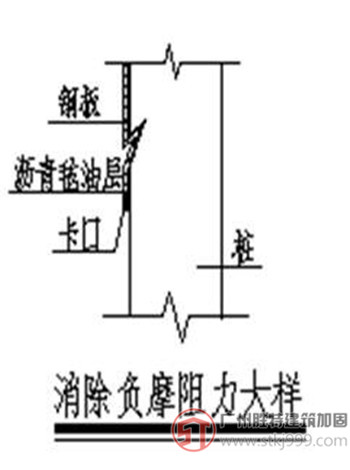 考慮到負摩阻力只發(fā)生在中段和上段兩截樁體,故對中段和上段兩截樁設置消除負摩阻力裝置。該裝置由鋼板與瀝青隔離層構成,樁體用鋼板包裹,鋼板與樁體之間設置3~5mm的氈油隔離層。鋼板下端加工成卡口狀,鋼板通過其卡口與樁身的卡口相互抵觸。當樁身相對于鋼板向下移動時,樁身卡口抵住鋼板卡口,帶動鋼板向下移動;當鋼板相對于樁身向下移動時,鋼板卡口便與樁身卡口脫離。若往后結構板下部地層發(fā)生沉陷,則鋼板卡口與樁身卡口脫開而自由下沉。由于鋼板與樁之間涂有氈油隔離層,樁側的摩阻力即可得到消除。為了節(jié)省鋼板材料,每截樁上的鋼板可以分段設置,每段鋼板下端都有卡口與樁身上的預埋卡口相互抵觸。上、下兩段鋼板之間應留有間隙,間隙的大小可按上、下兩段土層的平均沉降量之差進行估計,自上到下各段鋼板之間間隙因符合地層沉陷上大下小的規(guī)律。鋼板的厚度和卡口強度必須滿足壓樁時樁身帶動鋼板下沉所產生的拉力和剪力。