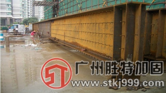 位于廣州越秀區(qū)西湖路63號(hào)的光明廣場(chǎng),經(jīng)營(yíng)單位需將第七層中廳改造為電影院使用。為滿足其功能使用荷載要求,需對(duì)原結(jié)構(gòu)承載力不足的進(jìn)行梁加固補(bǔ)強(qiáng)。由于條件限制,對(duì)第七層承載力不足的原梁加固施工僅能在其樓板面上進(jìn)行,且因?yàn)榭缍容^大,根據(jù)設(shè)計(jì)計(jì)算,梁端彎矩剪力都比較大,經(jīng)營(yíng)單位要求盡量減少新增加固構(gòu)件高度以滿足實(shí)際使用層高需要。