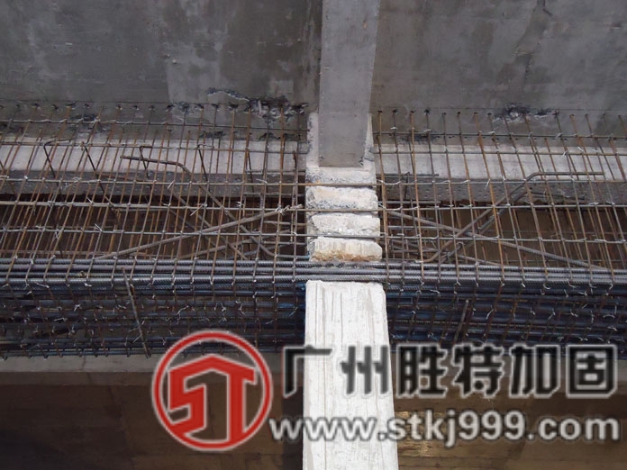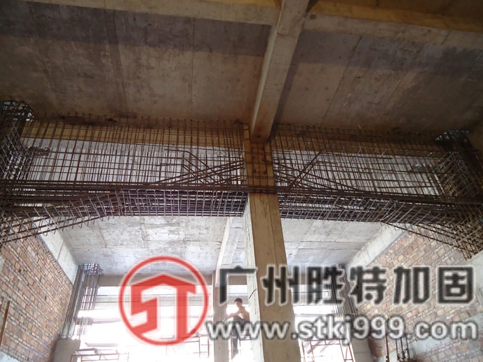 廣東省河源市區(qū)的文?;▓@綜合樓建筑層數(shù)共8層,總高度為33.6m,,總建筑面積約為12000.0㎡,為框架結(jié)構(gòu)體系,此建筑采用六度抗震設(shè)防,抗震等級(jí)為三級(jí),基礎(chǔ)采用PHC預(yù)應(yīng)力高強(qiáng)凝土管樁,以強(qiáng)風(fēng)化巖層作為樁端持力層,平面內(nèi)橫向柱距為4.0m,縱向柱距為6.0m??拐鸺庸谈脑?,由于建筑物使用功能改變,為讓建筑物增大空間,擬將首層橫向兩根柱拆除,需要進(jìn)行拔柱子加固,使梁跨度增大為8.0m,導(dǎo)致結(jié)構(gòu)傳力體系改變,需進(jìn)行托換加固處理,為滿足承載力及變形要求,設(shè)計(jì)采用大截面轉(zhuǎn)換梁支撐上部荷載,并在端部加腋處理,基礎(chǔ)采用錨桿靜壓樁加固,柱采用加大截面法加固,現(xiàn)施工已完成。