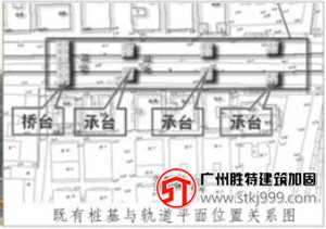 線路在DK26+968~DK27+052處沿彩虹橋從彩虹橋西側(cè)引橋下穿過,受到其影響,彩虹橋引橋有2處橋臺(tái),6處橋承臺(tái),共計(jì)16個(gè)樁基需托換。彩虹橋西引橋,共兩聯(lián),第一聯(lián)橋跨組成為25.03m+30.0m+25.0m,第二聯(lián)為單跨,跨度為28.0m,0號(hào)橋臺(tái)至3號(hào)橋墩間橋面寬度均為18.0m橋臺(tái)、橋墩基礎(chǔ)均采用直徑1.2米鉆孔灌注樁。