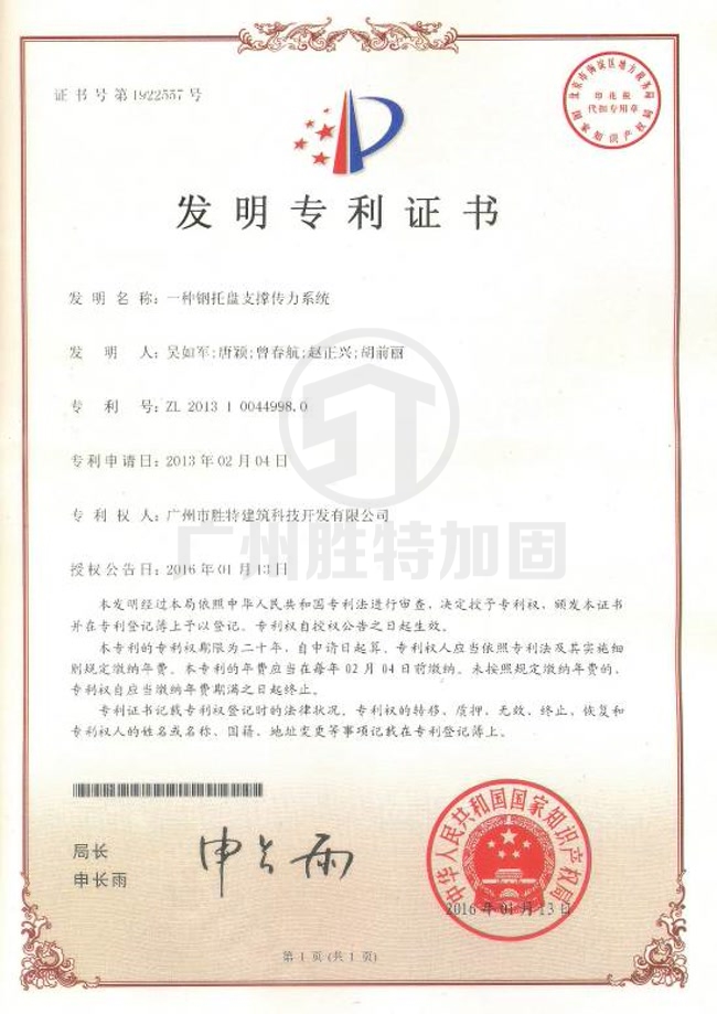 我司發(fā)明的“一種鋼托盤支撐傳力系統(tǒng)”,于2016年01月13日獲中華人民共和國國家知識產(chǎn)權(quán)局授予專利權(quán)。專利號:ZL 2013 1 0044998.0。該發(fā)明專利被廣泛運用于我司托梁拔柱、混凝土置換加固等工程。