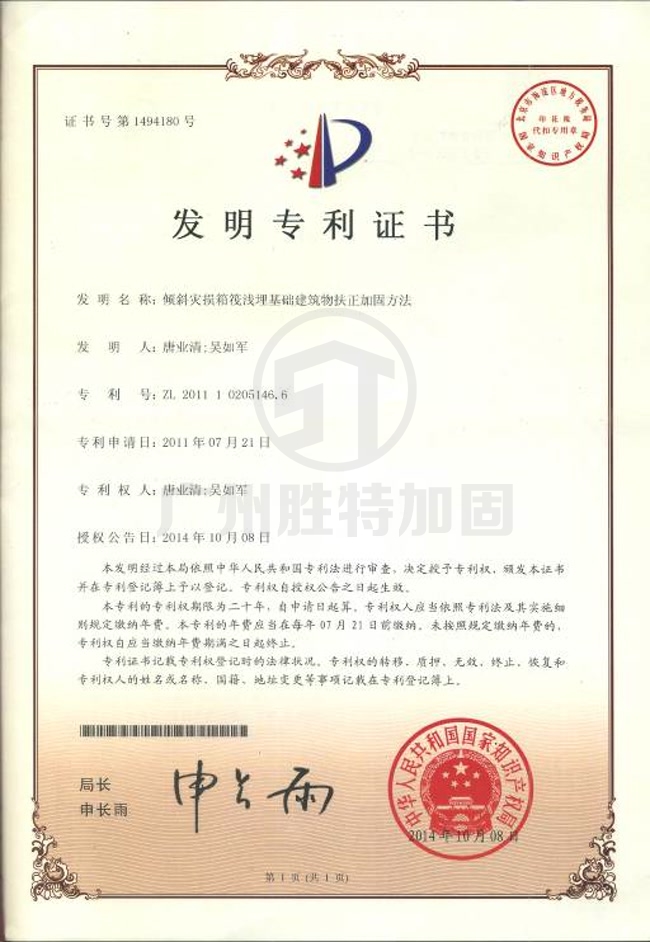 傾斜災(zāi)損箱筏淺埋基礎(chǔ)建筑物扶正加固方法-廣州市勝特建筑科技開(kāi)發(fā)有限公司加固專利技術(shù)、專利證書(shū)展示,科技成果展示.我司專注于等建筑糾傾,扶正加固工程設(shè)計(jì)及施工,多年來(lái)申請(qǐng)了多種特種工程技術(shù)專利.公司加固技術(shù)實(shí)力雄厚,獲國(guó)家高新技術(shù)企業(yè)認(rèn)證!歡迎廣大客戶來(lái)電咨詢或到我司考察.