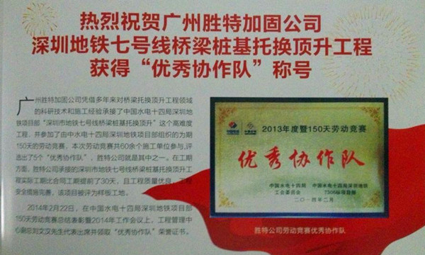 廣州勝特加固公司憑借多年來對(duì)橋梁托換頂升工程領(lǐng)域的科研技術(shù)和施工經(jīng)驗(yàn)承接了中國(guó)水電十四局深圳地鐵項(xiàng)目部“深圳市地鐵七號(hào)線橋梁樁基托換頂升”這個(gè)高難度工程。并參加了由中水電十四局深圳地鐵項(xiàng)目部組織的為期150天的勞動(dòng)競(jìng)賽,本次勞動(dòng)競(jìng)賽共60余個(gè)施工單位參與,評(píng)選出5個(gè)“優(yōu)秀協(xié)作隊(duì)”,勝特公司就是其中之一。在工期方面,勝特公司承建的深圳市地鐵七號(hào)線橋梁樁基托換頂升工程實(shí)際工期比合同工期提前了30天,且工程質(zhì)量?jī)?yōu)良,工程安全措施完善,該項(xiàng)目被評(píng)為樣板工地。