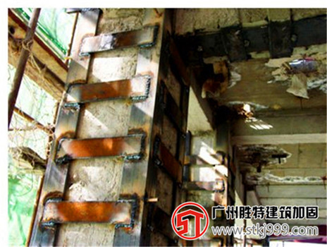 外粘型鋼法主要用于加固鋼筋混凝土構(gòu)件,可大幅度提高構(gòu)件的承載能力及抗震性能。如果構(gòu)件截面為矩形,通常在構(gòu)件的四角沿縱向外粘角鋼,并用橫向綴扳和斜向綴板連為整體,如果構(gòu)件截面為圓形或環(huán)形,通常沿縱向外粘扁鋼,橫向用鋼板套箍連為整體。