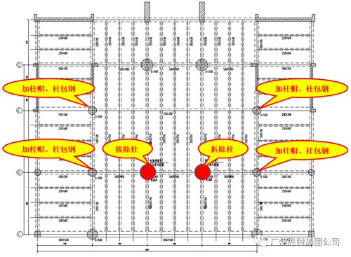 為了解決該問題,我司通過增設(shè)托換梁將兩根柱所承擔(dān)的荷載通過梁系轉(zhuǎn)換至周邊的豎向構(gòu)件,同時(shí)采用了我司專利技術(shù)“一種鋼托盤支撐傳力系統(tǒng)”。該技術(shù)已經(jīng)成功運(yùn)用在多個(gè)托梁拔柱及混凝土置換項(xiàng)目當(dāng)中,并取得良好的經(jīng)濟(jì)效益及效果。