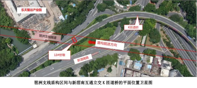 新建穗莞深城際琶洲支線是省重點工程,本標段線路自廣佛環(huán)線東環(huán)的琶洲站引出,沿會展四路下方向南前行,下穿黃埔涌后向東南方向延伸,途經(jīng)新滘東路與科韻路路口、環(huán)城高速、萬畝果園、官洲河后到達貝崗公園明挖段,再從貝崗公園明挖段大里程方向引出,下穿江樂海、新化快速、深井村后,到達黃埔區(qū)長洲街道金州南路東側的大學城東站。其中,13.65m 大盾構區(qū)間在DK1+400~+650 間下穿科韻路南延長線新滘南互通立交 K 匝道橋,該匝道橋 13#墩 2 根直徑 1200mm 的樁基在隧道范圍內(nèi),故對 13#墩進行樁基托換處理。