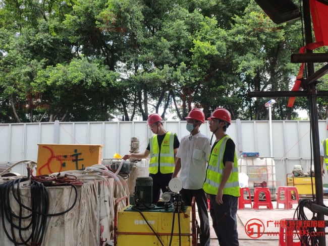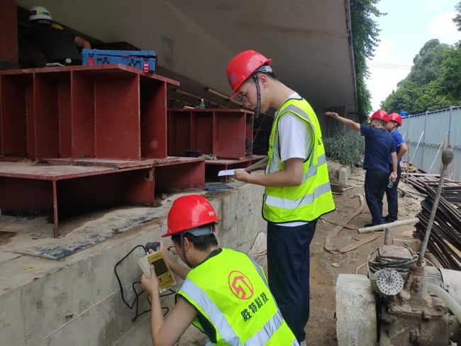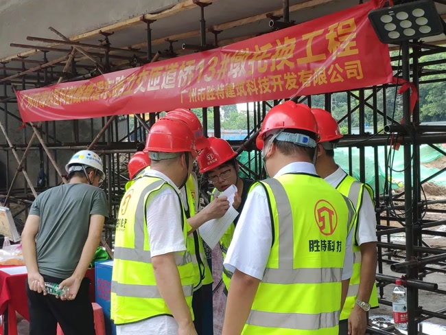 2022年7月24日上午9:00,我司現(xiàn)場管理人員、技術人員、施工人員都在自己的工作崗位上做好頂升準備,中鐵隧道股份有限公司領導、監(jiān)理、相關工作人員等也到達現(xiàn)場進行監(jiān)督和檢測。隨著我司項目負責人何茂總一聲令下,托換頂升正式開始。中鐵隧道股份有限公司和我司的領導及工作人員頂著39°的高溫酷暑,仍全神貫注地投入到頂升工作中,認真監(jiān)督、查看,并做好各項儀器設備數(shù)值的登記,在雙方領導及工作人員的共同努力下,《廣州市海珠區(qū)科韻路新滘東路立交匝道橋13# 墩托換工程》于2022年7月24日下午14:00順利頂升完成。