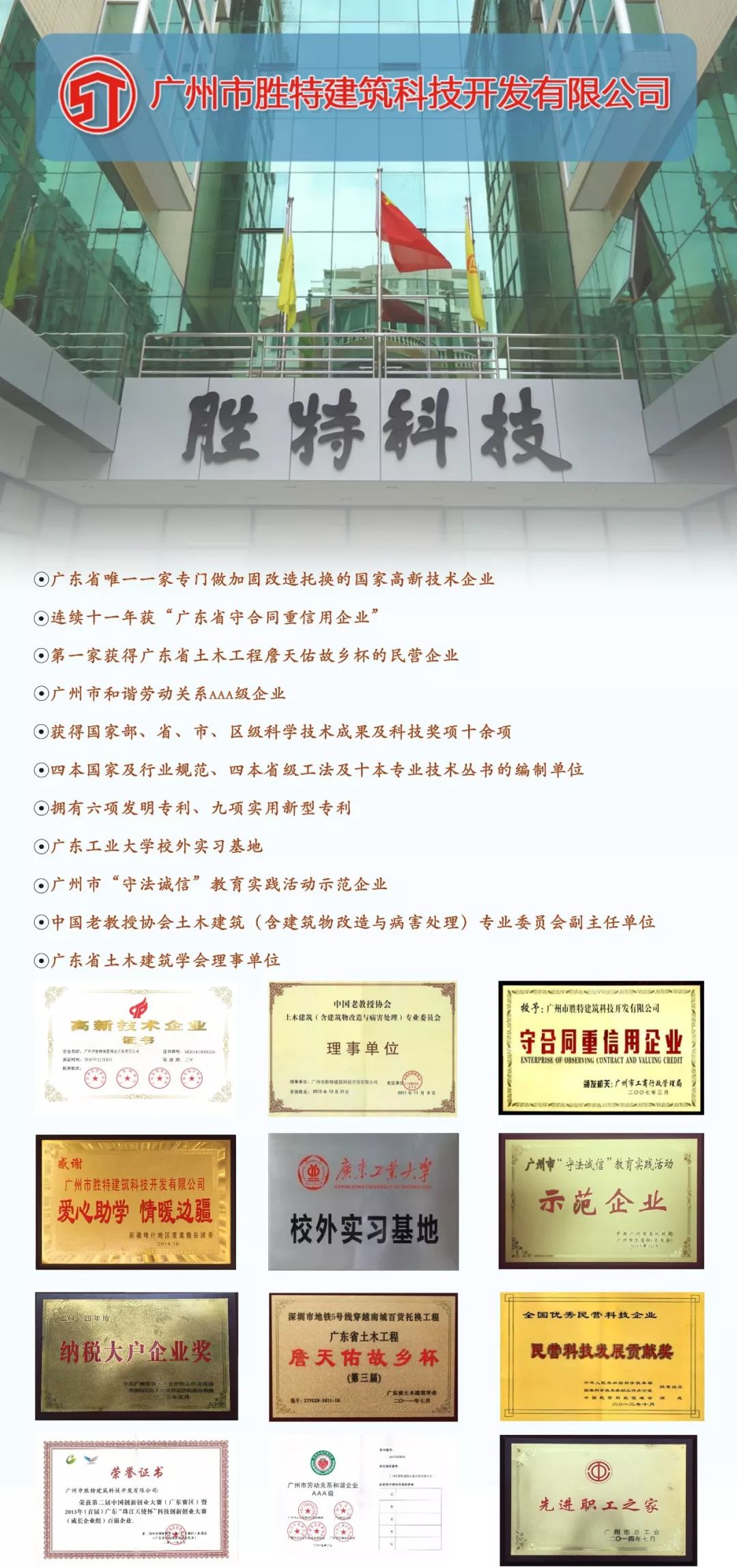 二十年前,在廣東省廣州市,曾有這樣一個(gè)企業(yè),他悄悄的誕生,他飛速的成長(zhǎng)。二十年后,今天,曾有這樣一群人,他們伴隨著這個(gè)企業(yè),走向成熟、走向睿智、走向夢(mèng)想、走向世界。這個(gè)企業(yè)他創(chuàng)造了同行業(yè)的業(yè)界神話,他的名字叫廣州勝特,這個(gè)企業(yè),他培育了一批又一批的業(yè)界能人,他們的名字叫勝特人。經(jīng)過(guò)二十年的不懈努力,勝特取得了傲人的成績(jī),先后獲得全國(guó)民營(yíng)科技發(fā)展貢獻(xiàn)獎(jiǎng)、廣東省科學(xué)技術(shù)獎(jiǎng)、土木建筑學(xué)會(huì)頒發(fā)的“第三屆詹天佑故鄉(xiāng)杯”、廣東省土木建筑學(xué)會(huì)科學(xué)技術(shù)獎(jiǎng)、廣州市科學(xué)技術(shù)獎(jiǎng)、廣州市白云區(qū)科學(xué)技術(shù)獎(jiǎng),廣東省土木建筑學(xué)會(huì)工程施工專業(yè)委員會(huì)頒發(fā)“先進(jìn)個(gè)人稱號(hào)”等多個(gè)獎(jiǎng)項(xiàng)??旄闲【幍哪_步,給你們展示不一般的勝特:
