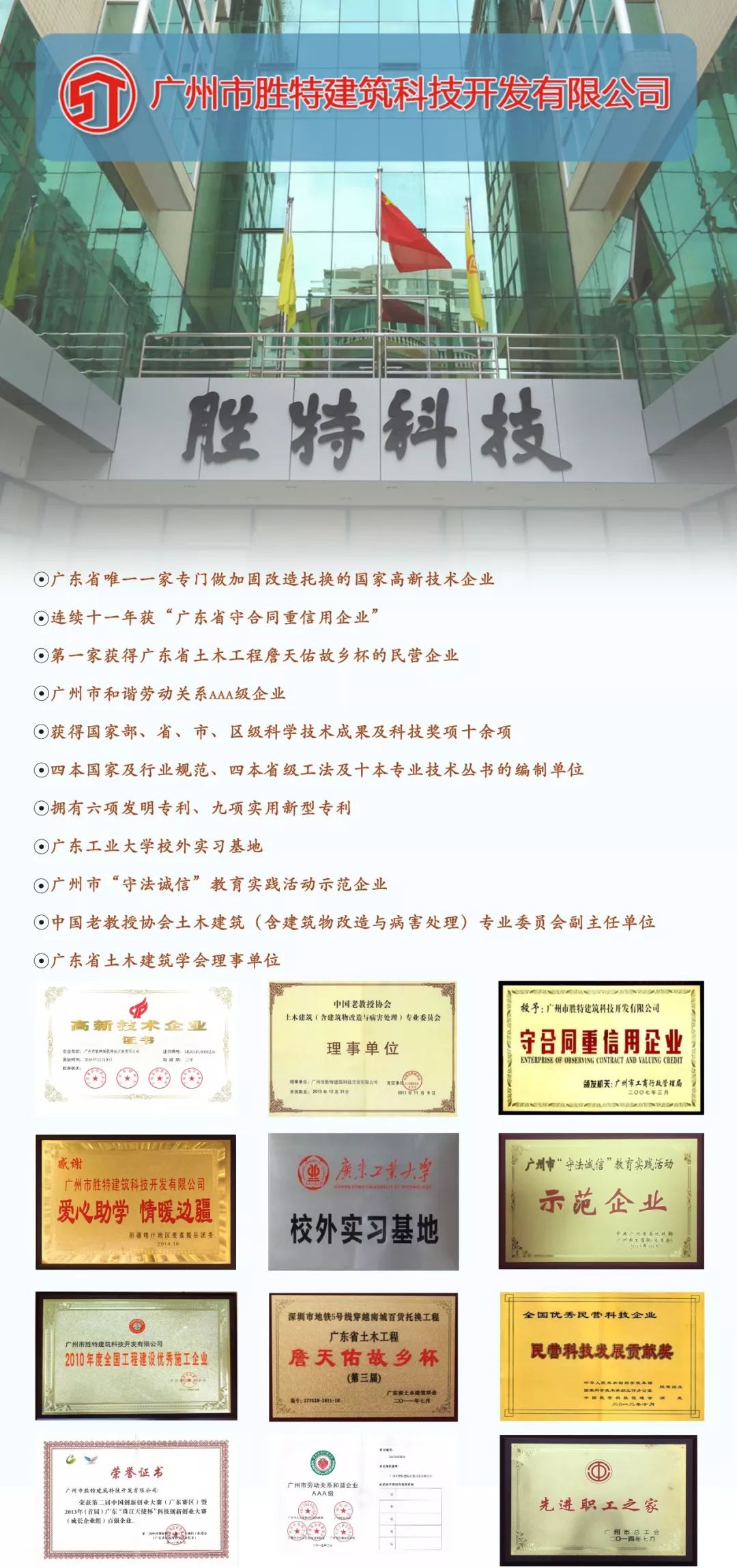 廣州市勝特建筑科技開發(fā)有限公司成立于1998年,當(dāng)時(shí)注冊(cè)資金10萬元,現(xiàn)注冊(cè)資金1380萬元,公司于2012年獲得高新技術(shù)企業(yè)認(rèn)證,2016年順利通過復(fù)審。公司以科研推動(dòng)施工技術(shù)進(jìn)步,以施工技術(shù)實(shí)踐轉(zhuǎn)換科技成果,通過不斷的技術(shù)創(chuàng)新,不但具有較強(qiáng)的開發(fā)與設(shè)計(jì)能力,更具有較高的現(xiàn)場施工能力。每年完成各種加固與改造、托換與糾傾及邊坡加固等工程二百余項(xiàng),至今已完成四千余項(xiàng)特種工程設(shè)計(jì)與施工,攻克了一個(gè)又一個(gè)的技術(shù)難題。公司本著“優(yōu)勝、特別、務(wù)實(shí)、開拓”的企業(yè)精神,艱苦創(chuàng)業(yè),力求精益求精,做到了人無我有,人有我優(yōu)。憑借著二十年自身的雄厚實(shí)力和良好的信譽(yù)保障,本著精干、高效的原則,運(yùn)用現(xiàn)代化的企業(yè)管理手段,相繼獨(dú)立完成了多項(xiàng)重大加固改造托換工程,業(yè)務(wù)范圍遍及全國各地,取得了很高的知名度與滿意度,樹起了良好的公司品牌形象,將“勝特”打造成中國加固改造行業(yè)的優(yōu)質(zhì)品牌。