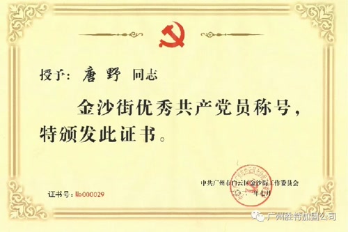 近日,我司黨支部書記、工會主席唐野同志被中共廣州市白云區(qū)金沙街工作委員會評為“優(yōu)秀共產(chǎn)黨員”。