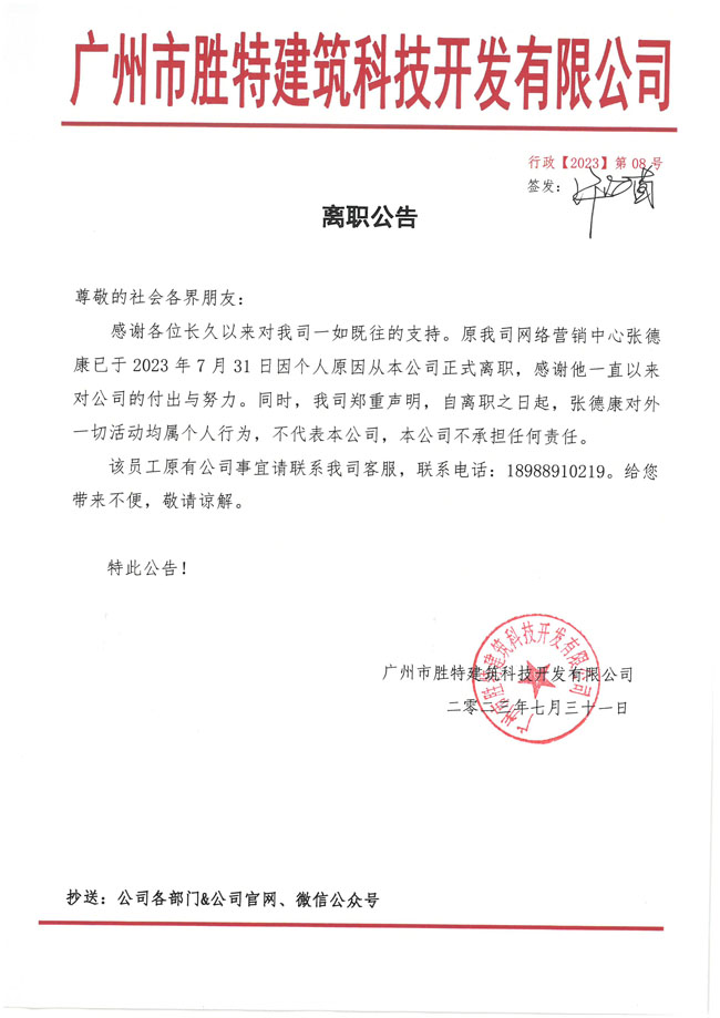 感謝各位長久以來對我司一如既往的支持。原我司網(wǎng)絡營銷中心張德康已于2023年7月31日因個人原因從本公司正式離職,感謝他一直以來對公司的付出與努力。同時,我司鄭重聲明,自離職之日起,張德康對外一切活動均屬個人行為,不代表本公司,本公司不承擔任何責任。