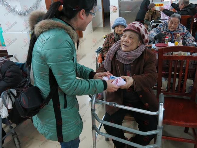 義工隊(duì)員親手遞禮品給老人家,奶奶拉著她們的手,關(guān)心的問她們冷不冷。