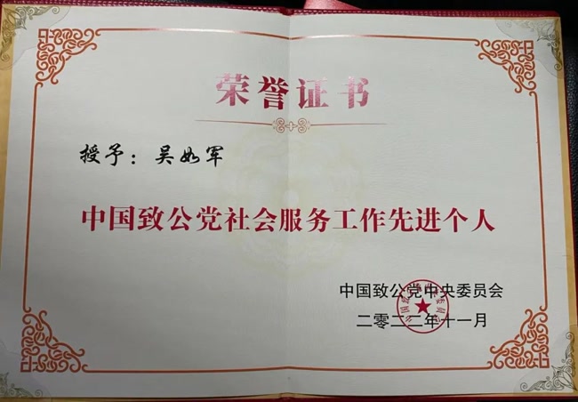 11月24日,在中國(guó)致公黨中央委員會(huì)召開(kāi)中國(guó)致公黨社會(huì)服務(wù)工作會(huì)議上,吳如軍董事長(zhǎng)獲“中國(guó)致公黨社會(huì)服務(wù)工作先進(jìn)個(gè)人”榮譽(yù)證書(shū)。