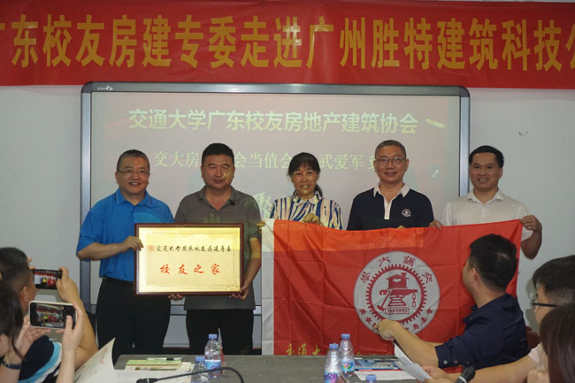 隨后,交大房建專委當(dāng)值會(huì)長(zhǎng)武愛軍會(huì)長(zhǎng)和廣鐵集團(tuán)機(jī)關(guān)事務(wù)部唐匯民專務(wù)為勝特公司吳如軍董事長(zhǎng)及唐穎副總經(jīng)理,頒發(fā)“交通大學(xué)廣東校友房建專委校友之家”牌匾并授旗。