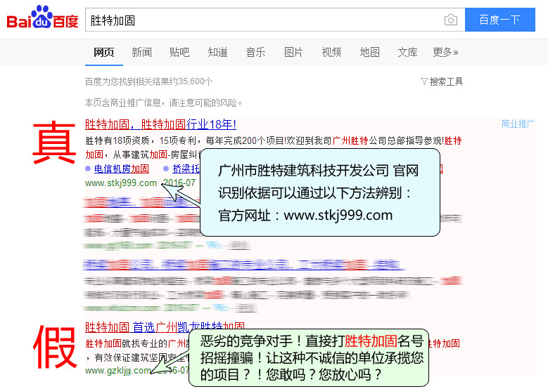 最近有客戶給小編打電話,第一句話就是:你是真的勝特還是假的勝特?。啃【幠涿盍税胩?,最后通過(guò)了解,才知道客戶在網(wǎng)上找了半天,發(fā)現(xiàn)多個(gè)打著“勝特加固”的名義在百度上推廣。咨詢了好幾個(gè)公司都覺(jué)得不靠譜,好不容易找到咱們這邊來(lái)了。通過(guò)客戶這樣一說(shuō),小編懷著忐忑不安的心情到百度上一搜!果然!?。。。?!對(duì)于這種嗤之以鼻的事,勝特人表示強(qiáng)烈的反感!莆田醫(yī)療事件之后,“百毒”再一次把加固行業(yè)推向浪尖~對(duì)于這種不誠(chéng)信的單位,客戶您怎么看???連自己的門面都拿不出了,你還相信他能給你拿真材實(shí)料做工程?再一次重復(fù)一遍,怎樣找到勝特公司的官網(wǎng)?溫馨提醒完畢,那怎樣通過(guò)其他方式來(lái)辨別勝特公司呢?