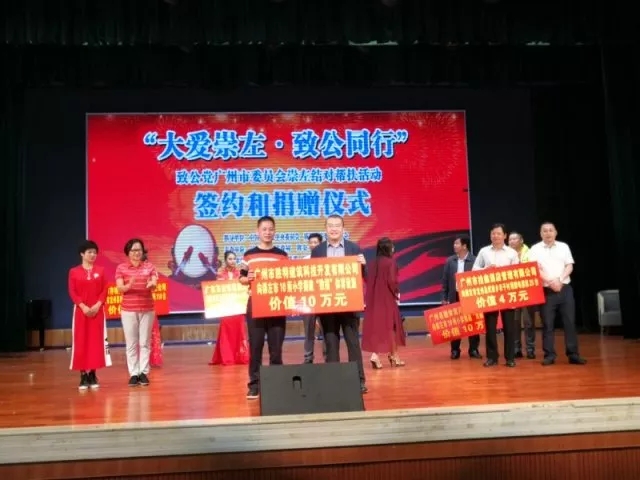 2017年10月20日,“大愛崇左·致公同行”結(jié)對幫扶活動簽約和捐贈儀式在廣西民族師范學(xué)院舉行。致公黨廣州市委會與崇左市相關(guān)領(lǐng)導(dǎo)舉行幫扶活動項目簽約捐贈儀式,計劃三年內(nèi)捐贈款物約68萬元,主要涉及一批幼師教育培訓(xùn)、電商培訓(xùn)、電子閱覽室建設(shè)等幫扶項目。