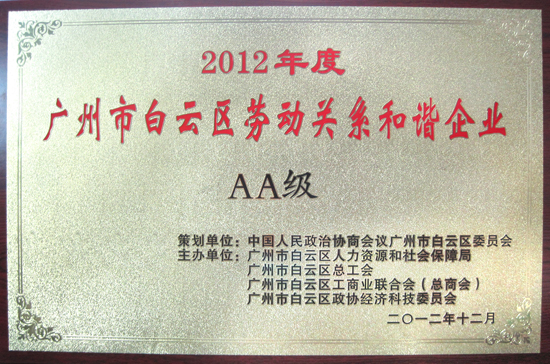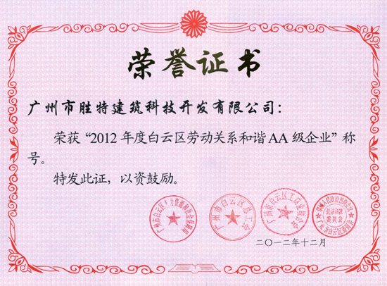 2012年12月31日晚,勝特加固公司應(yīng)邀參加了由中國人民政治協(xié)商會議廣州市白云區(qū)委員會策劃,廣州市白云區(qū)人力資源和社會保障局、廣州市白云區(qū)總工會、廣州市白云區(qū)工商業(yè)聯(lián)合會(總商會)、廣州市白云區(qū)政協(xié)經(jīng)濟科技委員會聯(lián)合主辦的2012年度白云區(qū)勞動關(guān)系和諧企業(yè)授牌儀式。我司代表先生在頒獎晚會上榮幸接受了“2012年度白云區(qū)勞動關(guān)系和諧AA級企業(yè)”的牌匾及證書。