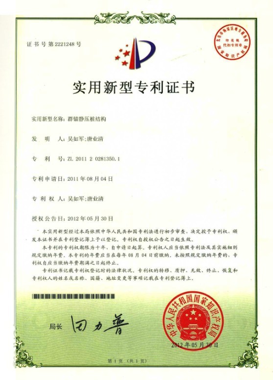 由公司董事長吳如軍先生、公司顧問唐業(yè)清教授共同發(fā)明的專利“群錨靜壓樁結構”于5月30日獲國家知識產權局授權。