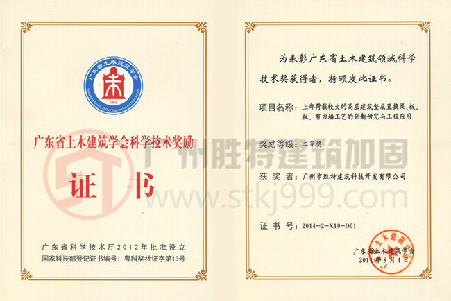 熱烈祝賀勝特建筑加固公司《上部荷載較大的高層建筑整層置換梁、板、柱、剪力墻工藝的創(chuàng)新研究與工程應(yīng)用》技術(shù)項(xiàng)目獲2014年第二屆廣東省土木建筑學(xué)會(huì)科學(xué)技術(shù)獎(jiǎng)二等獎(jiǎng)。勝特自成立以來(lái),一直專(zhuān)心致力于建筑物加固改造托換糾傾等技術(shù)的鉆研,經(jīng)過(guò)多年來(lái)的市場(chǎng)競(jìng)爭(zhēng),深入了解加固改造、托換糾傾領(lǐng)域的行業(yè)特點(diǎn)和競(jìng)爭(zhēng)焦點(diǎn),實(shí)施了科技創(chuàng)新優(yōu)先的生產(chǎn)策略,在大部分同行仍以低價(jià)競(jìng)爭(zhēng)占領(lǐng)市場(chǎng)的情況下,通過(guò)高科技開(kāi)發(fā)高附加值細(xì)分產(chǎn)品市場(chǎng)的戰(zhàn)略,搶先研發(fā)了多項(xiàng)綠色技術(shù),通過(guò)國(guó)家專(zhuān)利的新穎性、先進(jìn)性和獨(dú)特的排他性,牢靠地掌握高端市場(chǎng)。