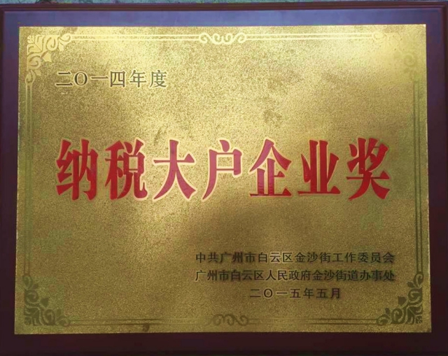 2015年5月29日,我司綜合研發(fā)中心總經(jīng)理女士代表我司出席了金沙街2014年度經(jīng)濟(jì)發(fā)展作出突出貢獻(xiàn)先進(jìn)單位的表彰大會(huì)。我司作為金沙街納稅額入?yún)^(qū)庫(kù)前5名的企業(yè),被廣州市白云區(qū)金沙街工作委員會(huì)、金沙街道辦事處授予2014年度“納稅企業(yè)大戶(hù)”稱(chēng)號(hào),獲頒獎(jiǎng)金1萬(wàn)元,我公司已連續(xù)2年獲得此榮譽(yù)稱(chēng)號(hào)。