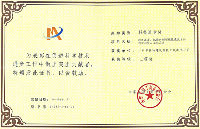 經(jīng)白云區(qū)工商業(yè)聯(lián)合會、廣州市工商業(yè)聯(lián)合會的逐級推薦及上報,在廣東省工商業(yè)聯(lián)合會經(jīng)濟科技與信息部及其各級領導的大力支持下,我司首次獲得的正部級獎項。此次能獲得“2014年度中華全國工商業(yè)聯(lián)合會科技進步獎”是對勝特一直堅持以綠色建筑加固技術科研的充分肯定。我們作為廣東省唯一專門從事建筑物加固改造托換的國家高新技術企業(yè),將堅持著為綠色加固業(yè)的創(chuàng)新而努力,并以促進行業(yè)的技術發(fā)展為己任,從而為社會解決行業(yè)各種技術難題,做一個有良心的優(yōu)質企業(yè)。