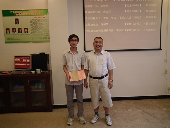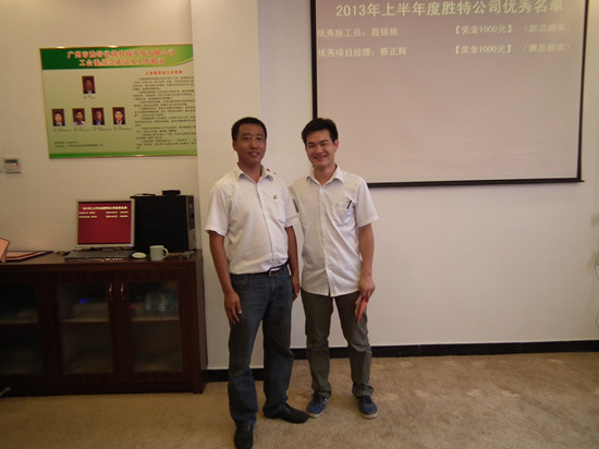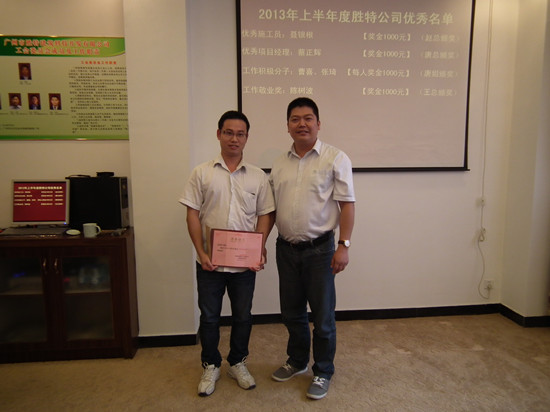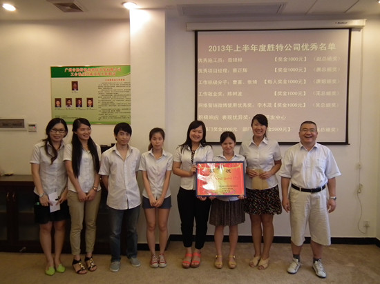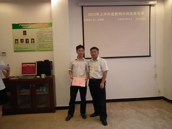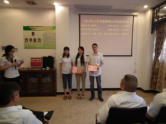 報(bào)告完畢后是勝特公司2013年上半年度優(yōu)秀員工頒獎,個(gè)人獲獎?wù)哂校簝?yōu)秀施工員,優(yōu)秀項(xiàng)目經(jīng)理,工作積極分子分別為張琦和、工作敬業(yè)獎、網(wǎng)絡(luò)營銷微博優(yōu)秀獎;綜合研發(fā)中心獲得了部門獎項(xiàng):積極響應(yīng)表現(xiàn)優(yōu)異獎。