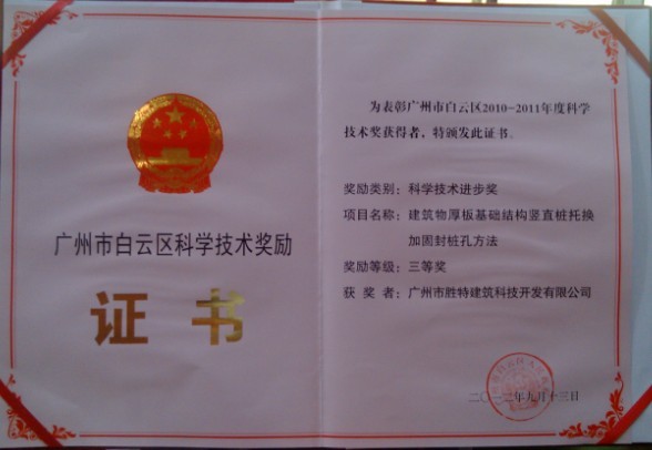 吳錦明副區(qū)長(zhǎng)首先總結(jié)了全區(qū)2010-2011年度科技和信息化的工作情況;區(qū)委常委、常務(wù)副區(qū)長(zhǎng)鐘向東宣讀了授予廣州市勝特建筑科技開(kāi)發(fā)有限公司“建筑物厚板基礎(chǔ)結(jié)構(gòu)豎直樁托換加固封樁孔方法”等20個(gè)項(xiàng)目廣州市白云區(qū)2010-2011年度科學(xué)技術(shù)獎(jiǎng)的表彰通報(bào);省、市科技部門領(lǐng)導(dǎo)和區(qū)五套班子有關(guān)領(lǐng)導(dǎo)親自向獲獎(jiǎng)單位頒發(fā)白云區(qū)2010-2011年度科學(xué)技術(shù)獎(jiǎng),我司董事長(zhǎng)兼總經(jīng)理吳如軍等代表依次登臺(tái)領(lǐng)獎(jiǎng),勝特建筑加固憑借雄厚的技術(shù)實(shí)力、豐富的工程案例,獲此殊榮是實(shí)至名歸。