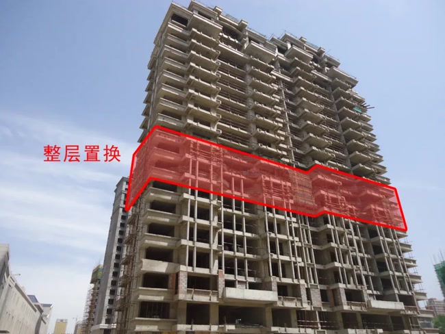 本項目位于廣東省中山市內,原設計為33層商住樓,大樓施工完成后,經(jīng)檢測發(fā)現(xiàn)16層墻柱17層梁板砼氯離子含量超標。經(jīng)甲方委托我司,對原結構砼氯離子含量超標的構件進行樓層混凝土置換,并保留上面層現(xiàn)有結構,共需置換面積為874.495㎡(砼量約為201.94m3)原砼強度為C25級。對于柱、梁、板置換分別采用了柱節(jié)點及梁板置換,柱節(jié)點置換為本工程的一個技術重點和難點。該項目于2012年3月中旬至2012年5月底完工,我司專利技術“一種鋼托盤支撐傳力系統(tǒng)”成功運用于以上綜合建筑物缺陷等項目置換加固。