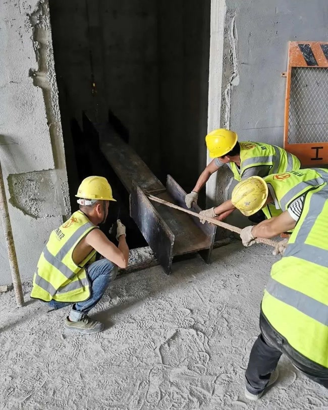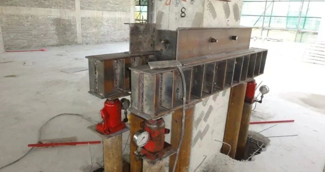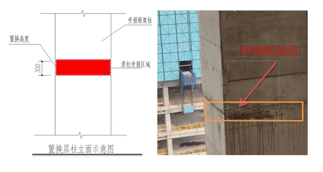本項目為一棟在建的超高層綜合樓(地上共42層、地下四層,框架-核心筒結構,建筑高度198米,總建筑面積約160000㎡,其中地下室建筑面積約60000㎡)經(jīng)檢測鑒定9m高跨層柱5根柱中施工縫位置存在不同程度的混凝土質量缺陷,對構件的承載功能或使用功能有一定影響。需要對23層兩根柱,33層、 37層、39層各一根柱,總共5根柱局部區(qū)域采用置換缺陷層加固處理。單柱最大軸向荷載約1300t,采用最大型鋼為800高。