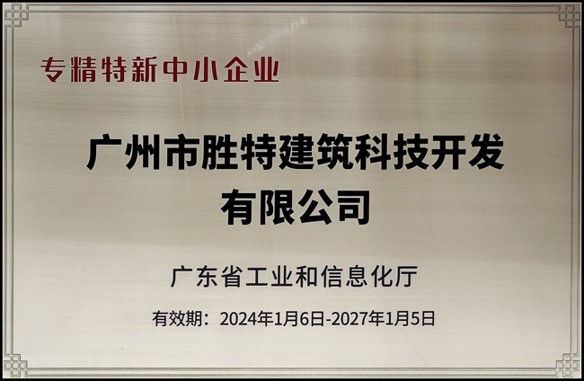 近日,廣東省工業(yè)和信息化廳發(fā)布了2023年專精特新中小企業(yè)名單,經(jīng)過地方初審、省工業(yè)和信息化廳復核、專家評審及社會公示等多個程序,廣州市勝特建筑科技開發(fā)有限公司成功獲評2023年廣東省“專精特新中小企業(yè)”。