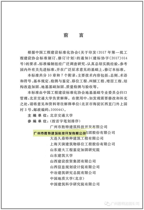 另外,從2003年開始勝特就聯(lián)合多位學(xué)術(shù)專家,陸續(xù)的完編多本國家規(guī)范,這些規(guī)范也填補了加固行業(yè)的空白,由于原規(guī)程己使用近十年,隨著加固、改造、托換等技術(shù)的不斷發(fā)展,近十年來各種創(chuàng)新技術(shù)不斷涌現(xiàn)。在2020年由我司主編或參編的多本規(guī)范正在修訂起草或送審中…….