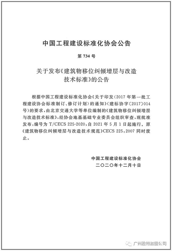 2020年12月10日,由我公司參與起草的T/CECS 225-2020《建筑物移位糾傾增層與改造技術(shù)標準》(以下簡稱“該標準規(guī)程”),經(jīng)中國工程建設(shè)標準化協(xié)會組織審查批準正式發(fā)布,自2021年5月1日起正式施行。