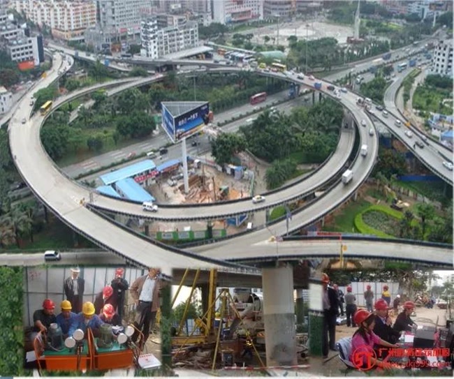 2012年與中國水電十四局深圳地鐵7號線某標(biāo)項目經(jīng)理部簽訂本項目的合作,深圳地鐵7號線筍崗站-洪湖站為雙層盾構(gòu)施工,地鐵線路與彩虹橋橋墩樁基發(fā)生沖突,彩虹橋引橋有2處橋臺,6處橋承臺,共計16個樁基需進行托換,本工程實施托換橋梁仍處于工作狀態(tài),橋面車流量較大,因而在實施主動托換,頂升等關(guān)鍵工序時疏解交通難度較大。整個托換施工橋面保持正常行車來往。做到“橋上正常通車,橋下穩(wěn)步施工”。