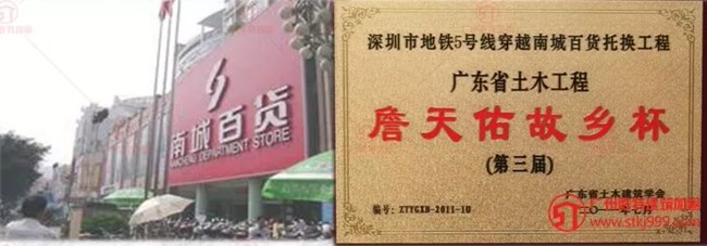 2009年9月與中鐵隧道集團三處有限公司深圳地鐵五號線項目經(jīng)理部簽署本項目合作,南城百貨商廈位于深圳市羅湖區(qū)東曉路與太安路交叉口,始建于2000年,竣工于2002年,該大廈屬于營業(yè)商業(yè)廣場,由于地鐵線路的開通,需要直接穿越該商廈邊跨整條軸線樁基。為保證上部商鋪超市正常運營以降低最大損失,我司經(jīng)過多次勘察現(xiàn)場,結(jié)合運用專利技術(shù)針對性地制定托換方案,做到只在地下室施工,采用“一托一吊”的方式將隧道上方建筑物的原荷載成功轉(zhuǎn)移。該技術(shù)屬全國首例,達到了良好的經(jīng)濟效益和社會效果,該工程于2009年6月開工,于2009年12月完成整體預(yù)定施工工作,截止2010年3月,我司仍對該建筑物隧道開挖期間進行檢測,并于2011年獲得第三屆廣東省土木工程界“詹天佑故鄉(xiāng)杯”,該獎項是廣東省土木工程界的最高獎項。我司成為首家獲此殊榮的民營企業(yè)。