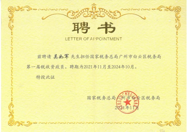 白云區(qū)稅務(wù)局領(lǐng)導(dǎo)為13名稅收資政員頒發(fā)聘書(shū),我司吳如軍董事長(zhǎng)作為廣州市第十五屆人大代表、白云區(qū)第十七屆人大常委委員會(huì)委員受聘任為白云區(qū)首屆稅收資政員之一。